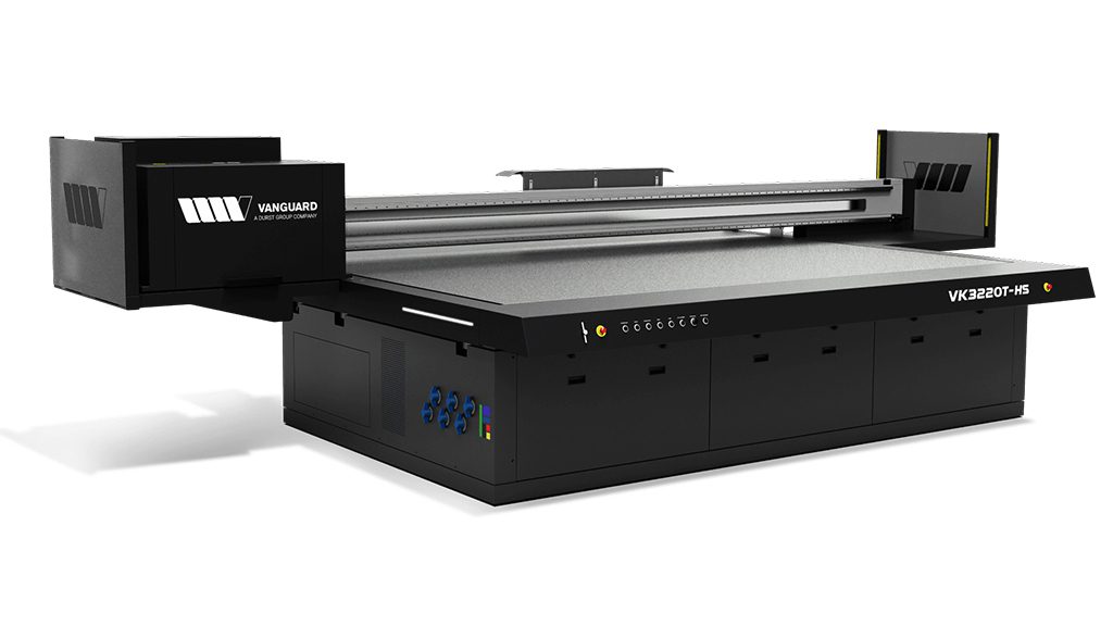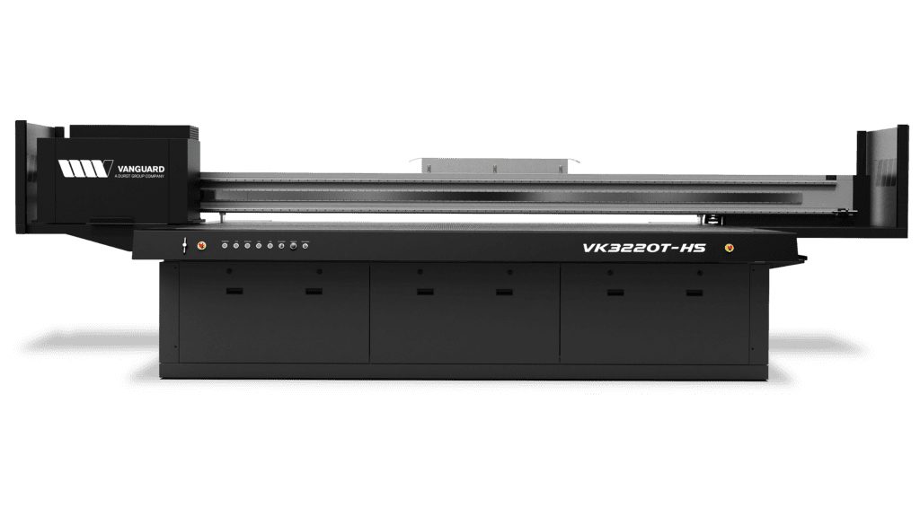 Lawrenceville, GA – October 2023: Vanguard Digital Printing Systems, a Durst Group Company, announces the newest addition to their printer portfolio, promising unparalleled quality at incredible speeds with phenomenal productivity. The highly anticipated North American debut of this brand-new flatbed printer is to be set at the PRINTING United Expo 2023 in their hometown of Atlanta, Georgia. The Vanguard VK3220T-HS ultra-high production UV-LED flatbed redefines productivity. The apex of Vanguard Digital’s evolution, this printer offers a larger bed size, up to three rows of industrial printheads for maximum productivity, an electromagnetic carriage drive system for speed and precise drop placement delivering exceptionally high print quality, as well as field-upgradeability for peace of mind, making this printer the ultimate option for any print service provider. With up to 1800 dpi print resolution and speeds up to 3,875 sqft/h, the only limitation is your imagination. Jim Peterson, COO and Founding Partner, Vanguard Digital North America, commented “The VK3220T-HS is the culmination of years of technological advancements and our response to the demands of the market. We are dedicated to delivering the best printers available, and through our innovation and commitment to our customers, we have created the new benchmark for speed and quality, with a focus on productivity and efficiency. The VK3220T-HS symbolizes the start of a new chapter for Vanguard Digital, and we are so proud to share it with the North American market.” The VK3220T-HS can print on nearly any substrate up to 4″ (10cm) thick and is driven by an electromagnetic drive, ensuring tight dot placement for remarkable print quality and speeds. Combined with a seven-zone, user-selectable vacuum system, this printer ensures efficient hold-down for no unintended media movement and easy transitions between jobs. Other strategic features include auto height detection, one-touch pin registration, front-to-back and back-to-front printing, water-cooled LED curing technology, and ionization bars making the VK3220T-HS flatbed printer the most productive printer for your printshop.