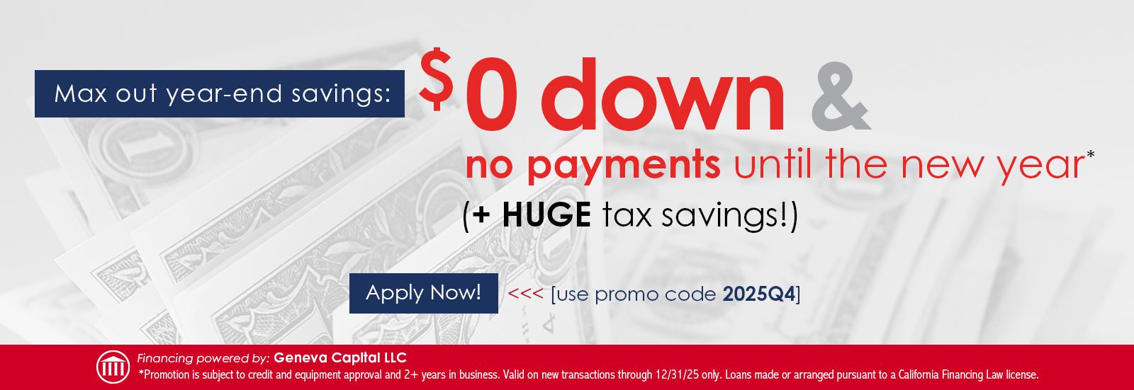 *Finance promotion is subject to credit and equipment approval and 2+ years in business. Valid on new transactions through 12/31/25 only. Tax savings are used for illustrative purposes only and will vary. We recommend each customer consult with their tax advisor. Loans made or arranged pursuant to a California Financing Law license.